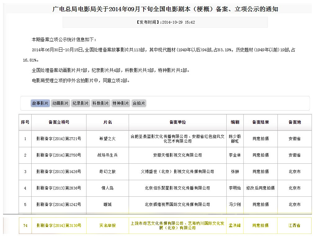 十月二十九日,本公司出品的院線電影《實(shí)名舉報(bào)》正式獲得拍攝許可證,并在廣電總局網(wǎng)站公示。項(xiàng)目進(jìn)入籌備當(dāng)中歡迎眾多投資商和廣告植入商聯(lián)系我們。