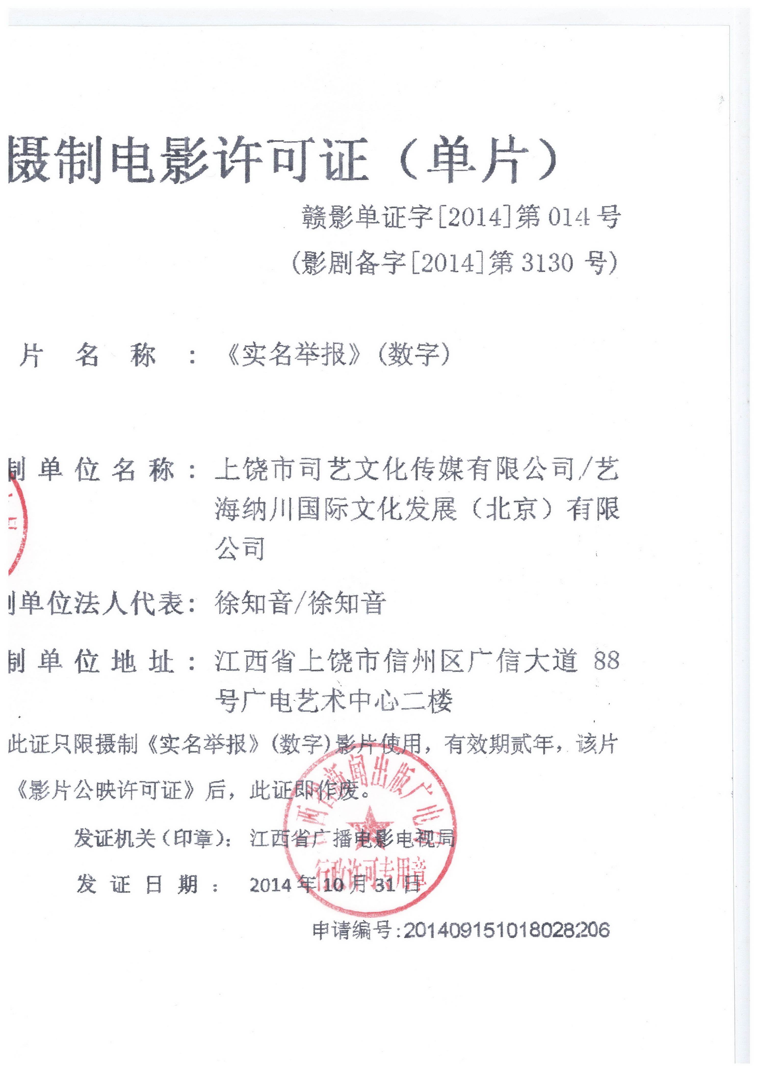 電影《實(shí)名舉報(bào)》獲得拍攝許可證(單片)