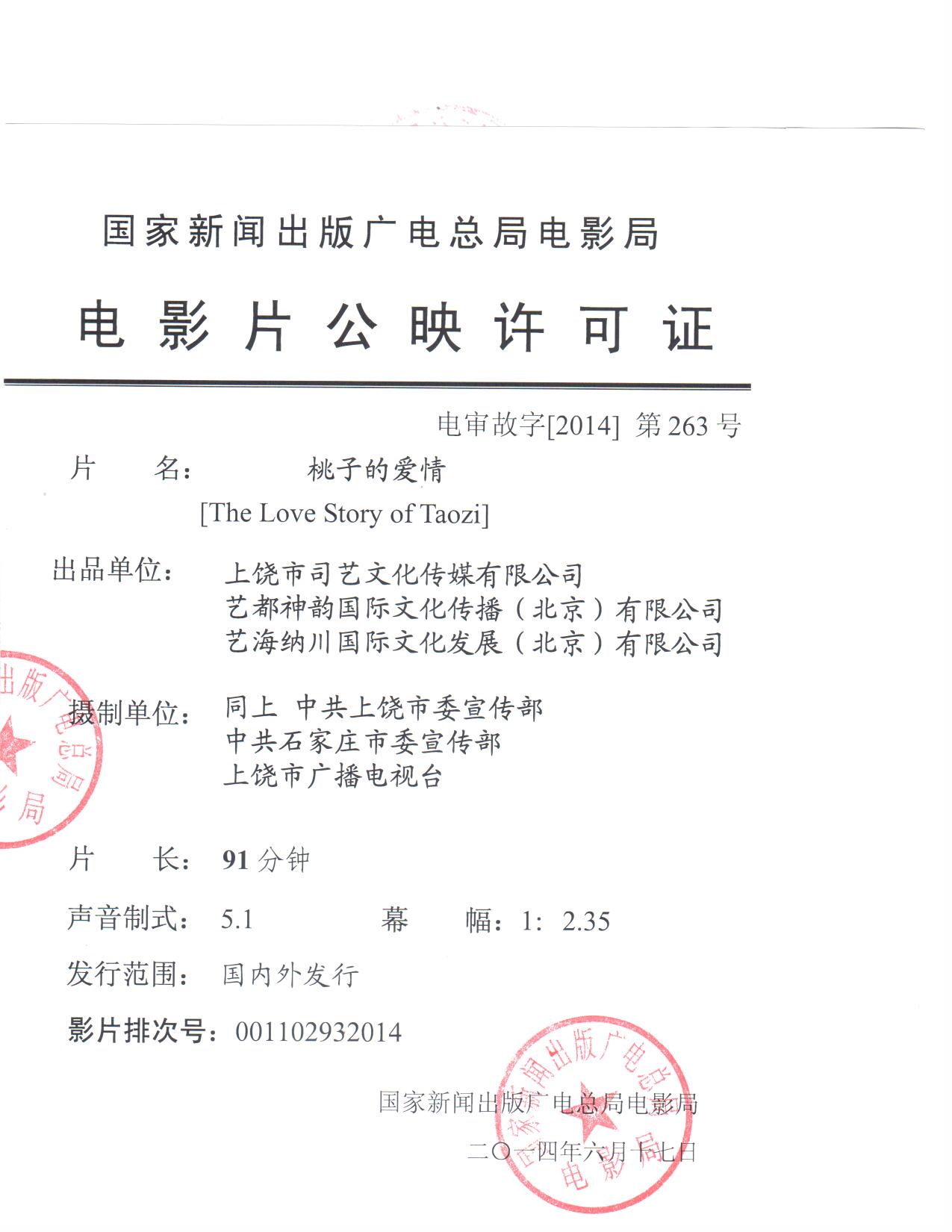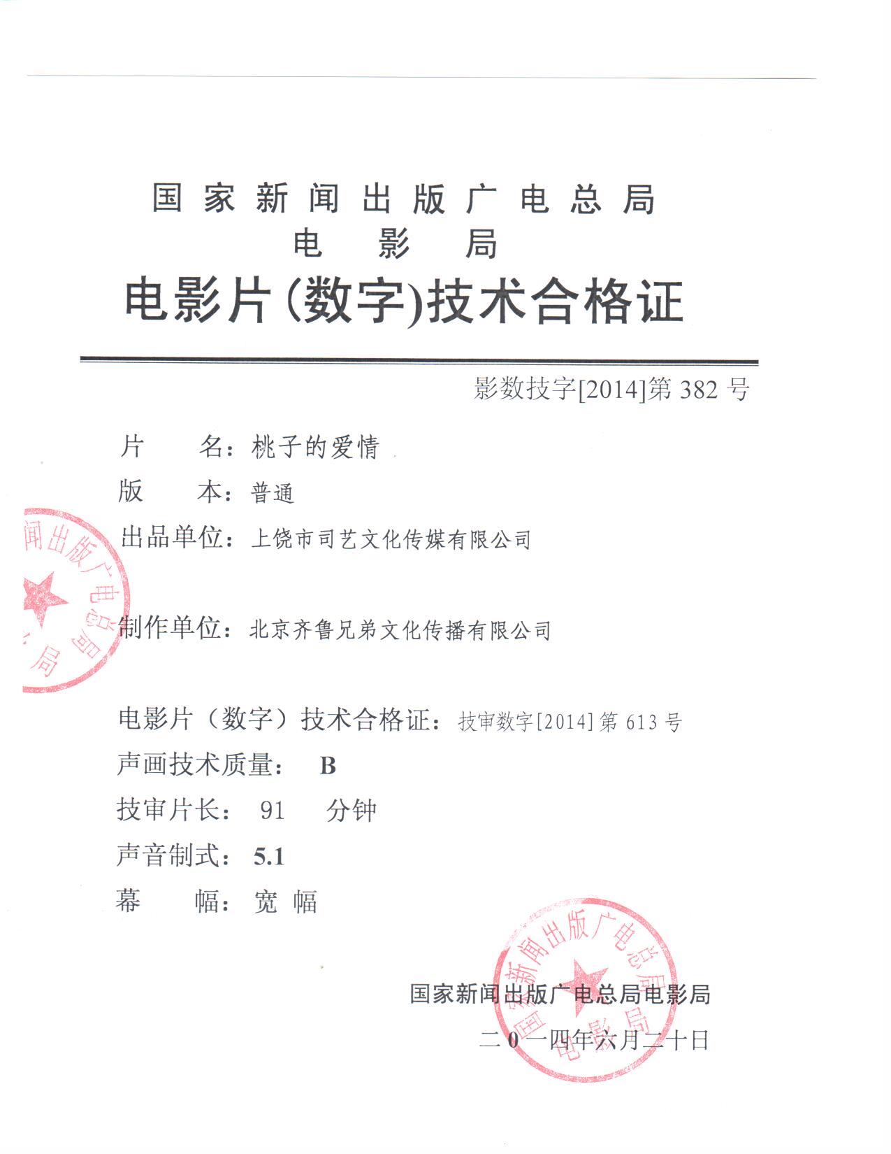 院線電影《桃子的愛(ài)情》目前已經(jīng)取得公映許可證和技術(shù)合格證,近期即將上映,歡迎廣大廣告商聯(lián)系我們。