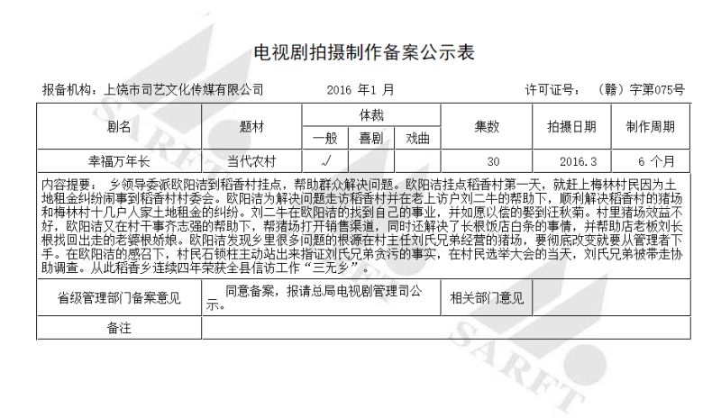 公司新作電視劇《幸福萬年長》今日取得廣電總局公示。歡迎有合作意向的單位與個人與我們聯(lián)系。