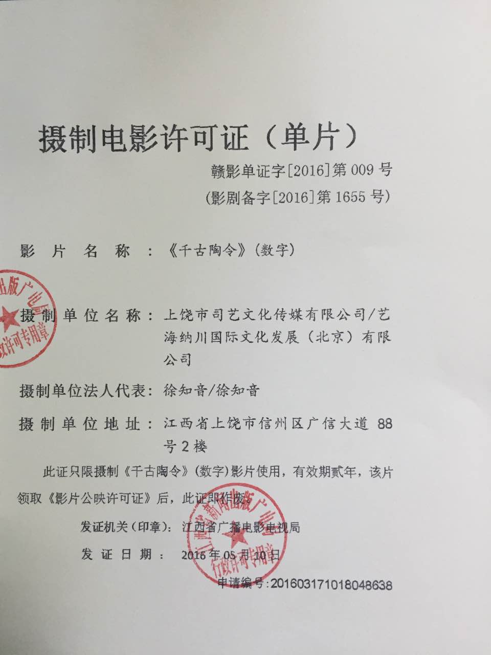電影《千古陶令》獲得攝制許可證