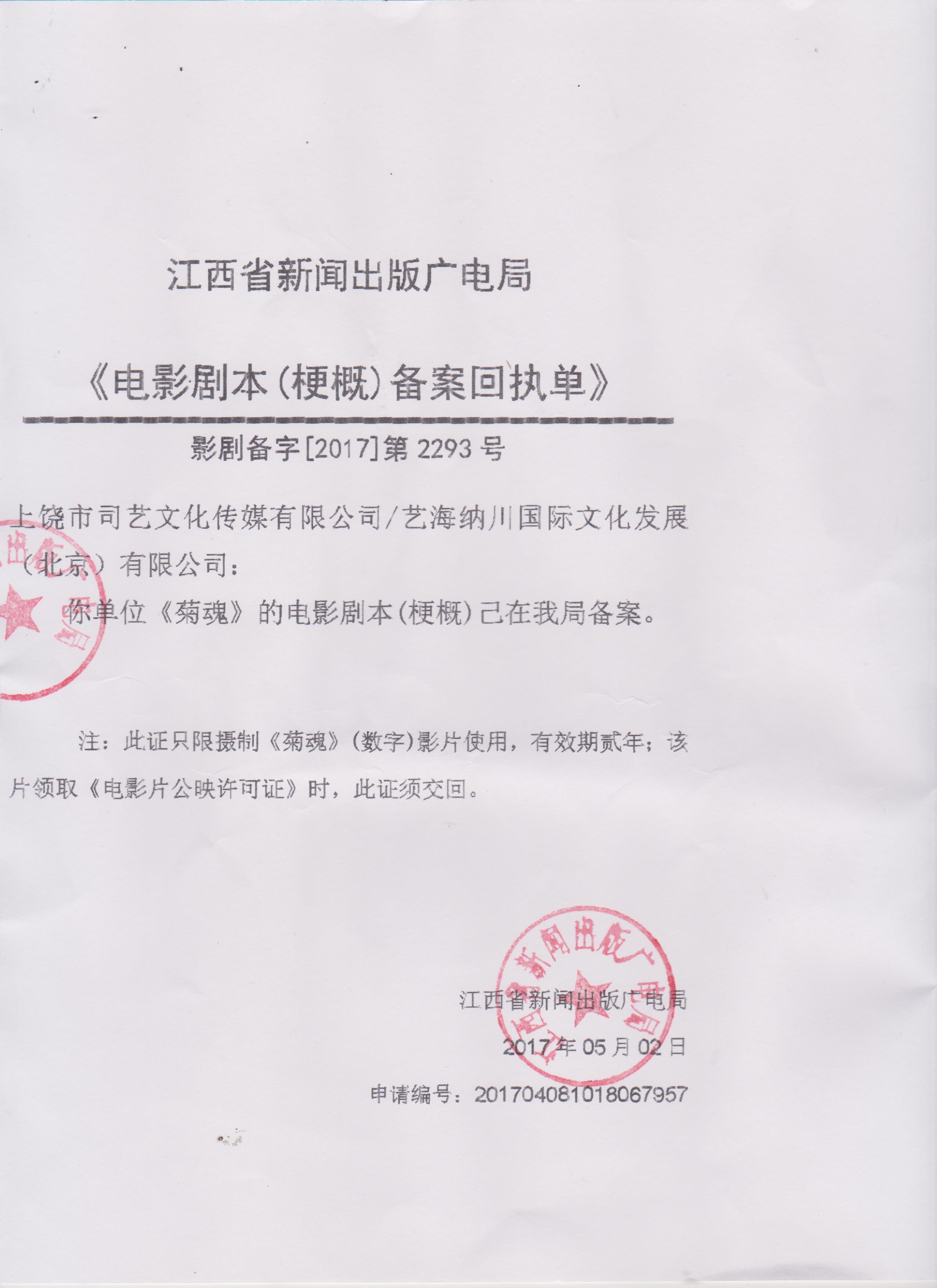 電影《菊魂》取得攝制許可證