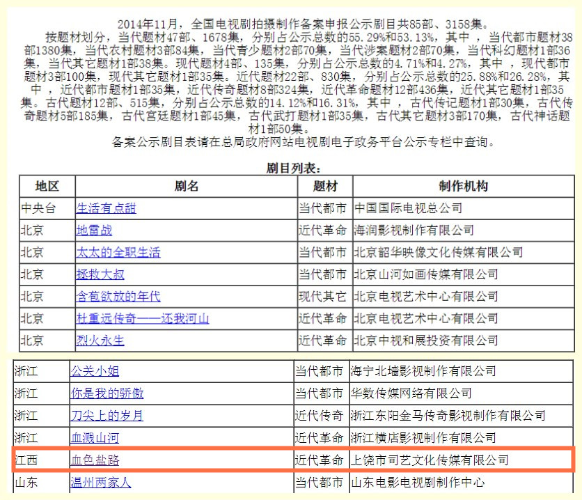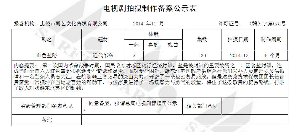 本公司申報的電視劇《血色鹽路》正式通過審批,在廣電總局官網(wǎng)2014年第11批中公示。