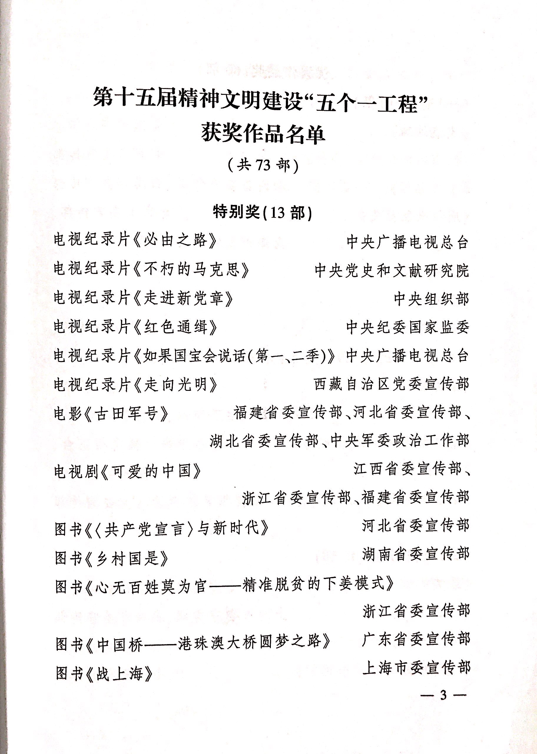 8月19日,第十五屆精神文明建設(shè)“五個一工程”獲獎作品名單在京揭曉,藝海納川國際文化發(fā)展(北京)有限公司出品承制的電視劇《可愛的中國》榮獲“特別獎”。